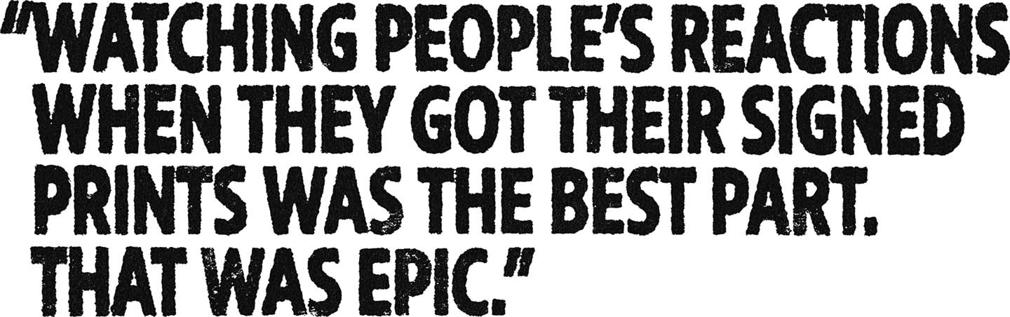 Every project is a challenge in some way—that’s what drives me. I like figuring things out as I go, making adjustments, and seeing how far I can push an idea. The reward comes at the end, when it all clicks. Seeing the prints come to life and watching people’s reactions when they got their signed prints was the best part. That was epic.